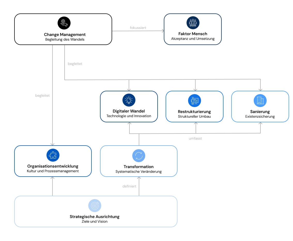 Change Management Grafik: Übersicht über Change Management mit Fokus auf Faktor Mensch, digitaler Wandel, Restrukturierung, Sanierung, Organisationsentwicklung, Transformation und strategische Ausrichtung im Unternehmen