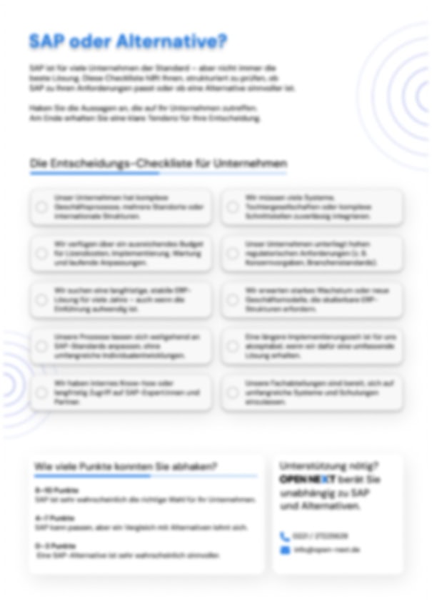 Durch das einfache Punktesystem der Checkliste entsteht schnell eine klare Tendenz: Unternehmen erkennen, ob SAP wahrscheinlich die richtige Wahl ist, ob ein Vergleich mit Alternativen sinnvoll erscheint oder ob eine alternative ERP-Lösung eher zu ihren Anforderungen passt.